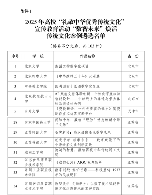 近日,教育部办公厅公布了2025年高校“礼敬中华优秀传统文化”宣传教育活动结果。我校选送的《数智焕活•文韵新生:以数字技术赋能传统文化活态传承的常纺实践》成功入选“数智未来”焕活传统文化案例遴选名单;《留青竹刻:方寸之间的文化基因与东方美学》成功入选“魅力非遗”原创作品遴选名单。