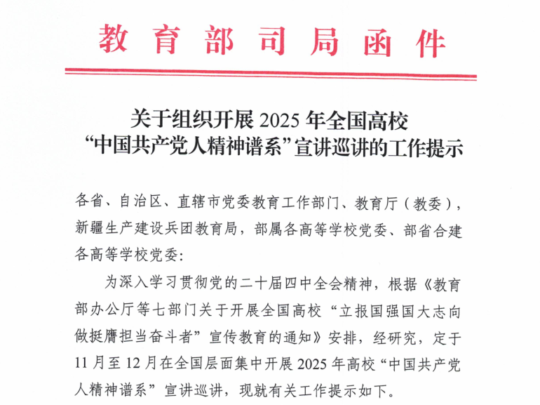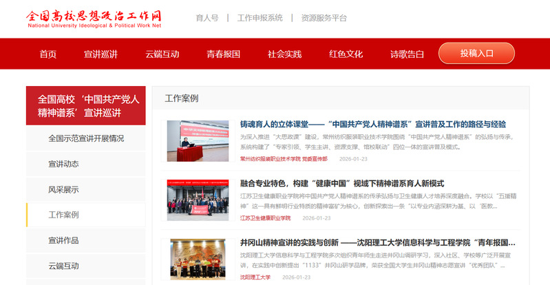 近日,我校“铸魂育人的立体课堂——‘中国共产党人精神谱系’宣讲普及工作的路径与经验”成功入选2025年全国高校“中国共产党人精神谱系”宣讲巡讲工作案例,并在全国高校思想政治工作网发布。2025年全国高校“中国共产党人精神谱系”宣讲巡讲由教育部思想政治工作司主办。